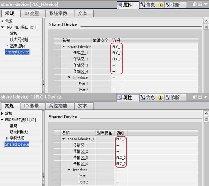 4.1、分别为控制器PLC_1和PLC_2配置对智能设备共享的访问,进入"属性>常规>Share Device"界面,在这里选择控制器PLC_1访问传输区1和2,控制器PLC_2访问传输区3和4,如下图13所示。