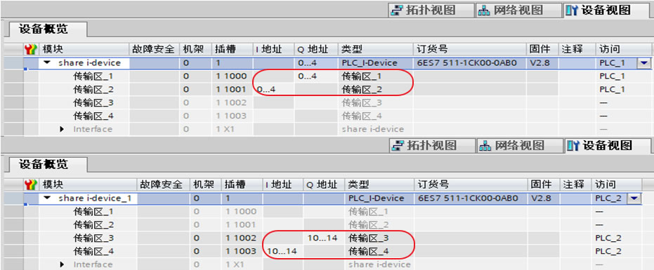 4.2、切换到工作区的“设备视图”,在列表栏的设备概览处分别为2个智能设备分配与控制器的传输地址区,这里只能设置有访问权限的传输区,如下图14所示。