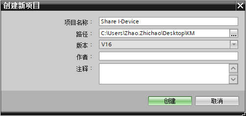 1.1、打开TIA 项目视图,在菜单项目下选择新建,在弹出的创建新项目窗口选择项目名称(Share I-Device)和存储路径,然后点击创建按钮,如下图2所示