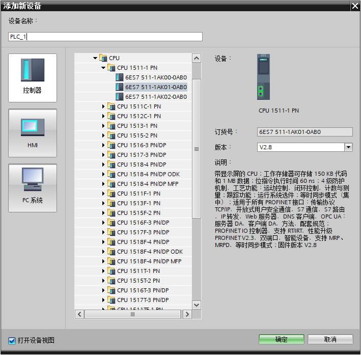 1.2、在项目树下双击“添加新设备”,输入设备名称(PLC_1),选择控制器(6ES7511-1AK01-0AB0 版本V2.8),单击确定进入设备视图,如下图3所示