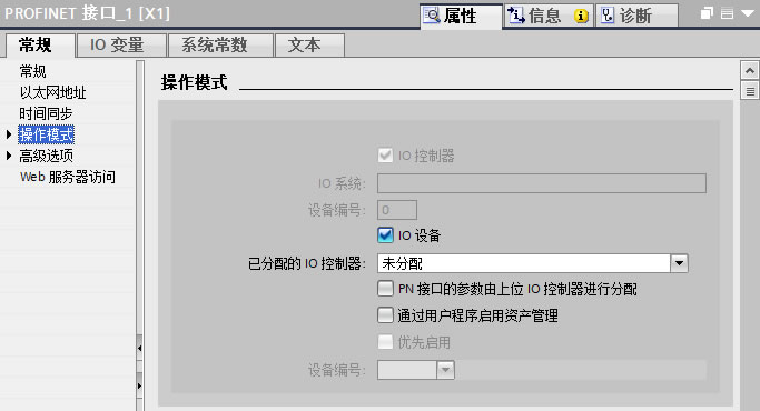 2.1、双击控制器PLC_I-Device接口,进入"属性>常规>操作模式"界面,勾选IO设备,如下图7所示。