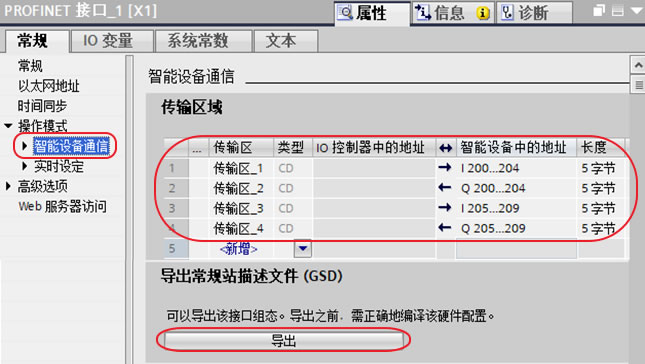 2.3、还是图7界面路径,点击智能设备通信,新建4个传输区,设置传输区地址及长度,编译通过后导出GSD文件存储后以供后续使用,如下图9所示。