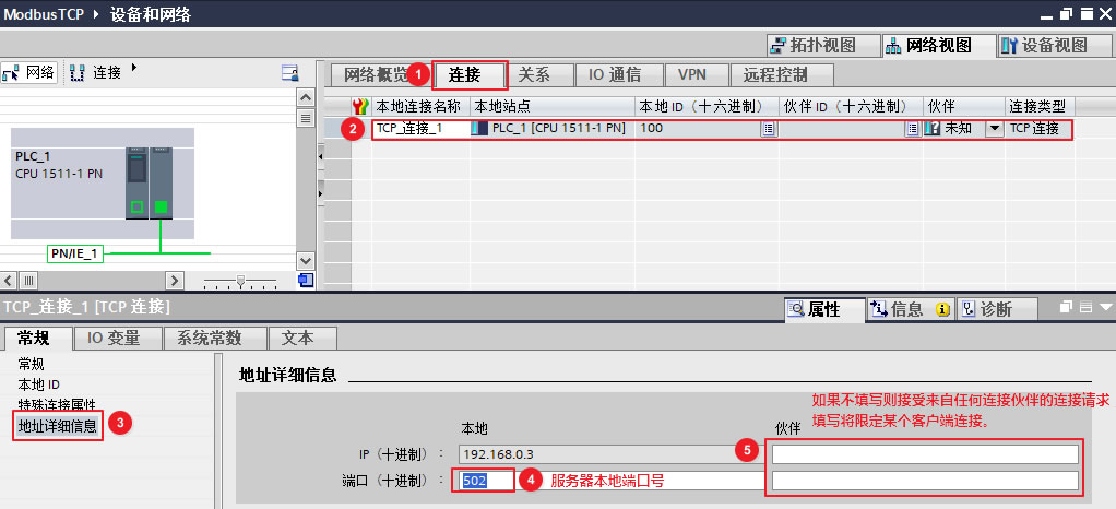 "TCP_连接_1"为建立的连接,选中该连接,在属性的"地址详细信息"中可以设置该TCP 连接的相关信息,如下图9所示。