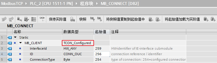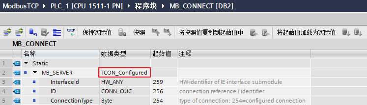 添加一个全局数据块用于匹配功能块"MB_SERVER"的管脚"CONNECT",本例中为数据块DB2(块名称:MB_CONNECT),打开该数据块,创建变量 "MB_Server",手动在数据类型框中输入"TCON_Configured",并将该变量关联到功能块"MB_SERVER"的管脚参数"CONNECT"上,如下图10所示。数据类型“TCON_Configured”的各参数含义及本例中设置如下表5所示。