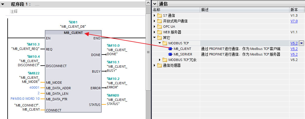 "MB_CLIENT"指令通过CPU 或 CM/CP 的本地接口作为ModbusTCP客户端进行通信,无需要任何额外的硬件支持。使用"MB_CLIENT"指令在客户端和服务器之间建立连接,发送请求和接收响应,并控制断开连接。