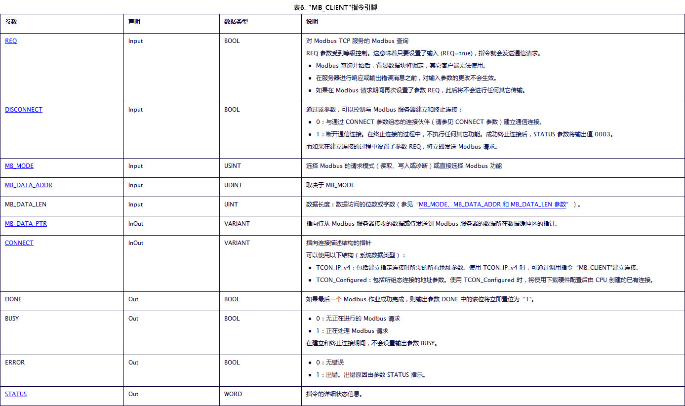 2.4、使用上述指令实现CP1543-1为Modbus TCP的 Client与通信伙伴建立通信,通过表6可知CONNECT参数的设定有两种方式,下面分别介绍这两种方式如何创建CONNECT参数。