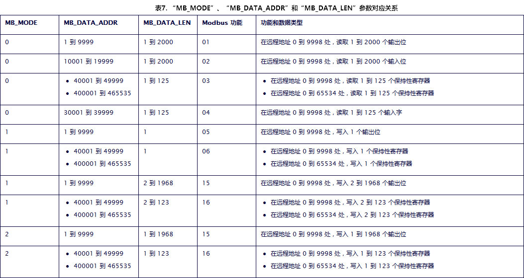 2.3、参数 MB_MODE、MB_DATA_ADDR 和 MB_DATA_LEN 的组合定义了 MB_MODE 值为 0、1 和 2 时,当前 Modbus 消息中所用的 Modbus 功能代码,对应关系如下表7所示。