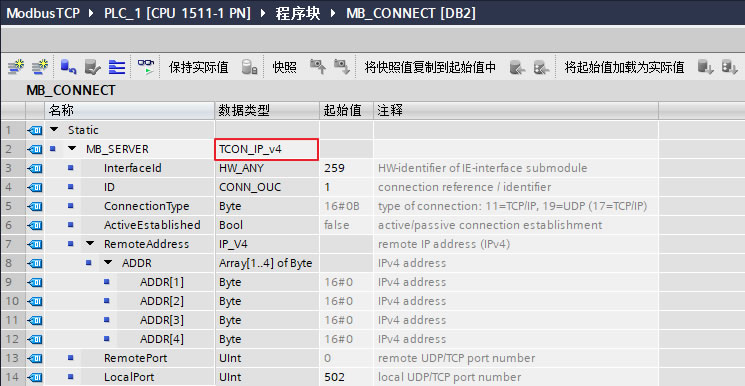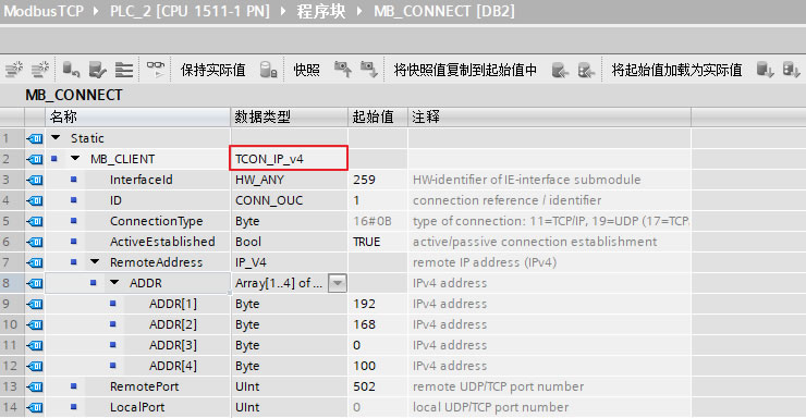 添加一个全局数据块用于匹配功能块"MB_CLIENT"的管脚"CONNECT",本例中为数据块DB2(块名称:MB_CONNECT),打开该数据块,创建变量 "MB_CLIENT",手动在数据类型框中输入"TCON_IP_v4",并将该变量关联到功能块"MB_CLIENT"的管脚参数"CONNECT"上,如下图15所示。数据类型“TCON_IP_V4”的各参数含义及本例中设置如下表8所示。