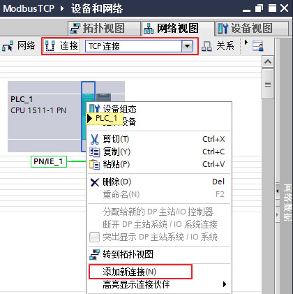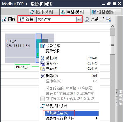 (2)通过"网络视图"创建TCP连接后,再使用TCON_Configured结构创建连接参数。在"网络视图"窗口,左上侧选择"连接"按钮,选择”TCP连接“,然后在CPU上点击鼠标"右键"并选择"添加新连接"。如下图7所示。
