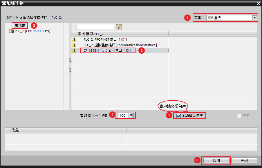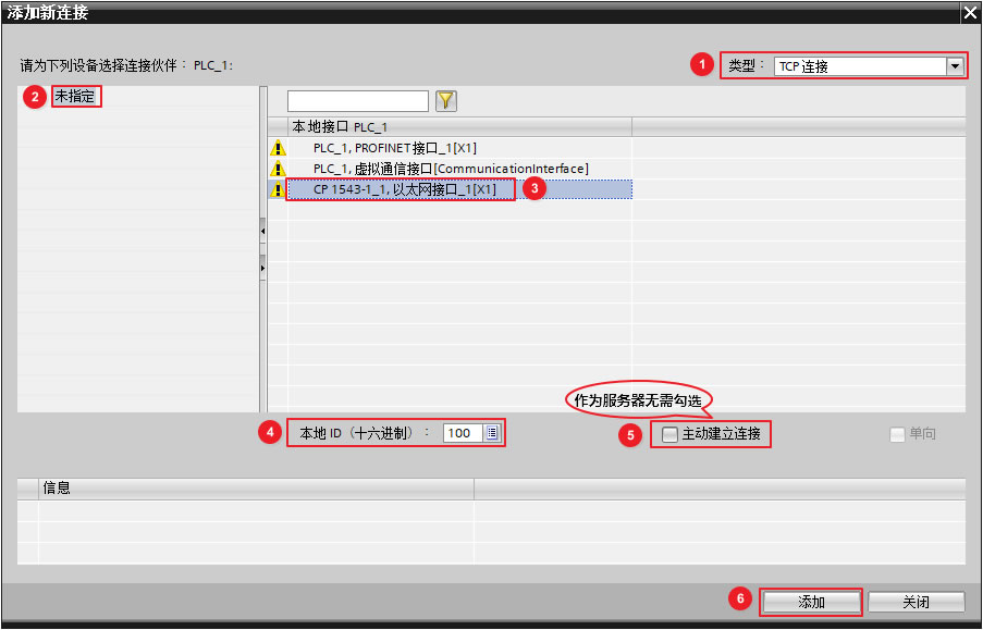 在"添加新连接"窗口中,"类型"选择为"TCP连接",伙伴选择"未指定",本地接口选择"CP1543-1,以太网接口_1[X1]",分配本地连接ID,服务器为被动连接,点击 "添加"创建TCP 连接,如下图8所示。