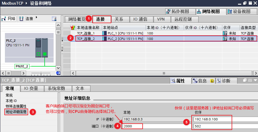 "TCP_连接_2"为建立的连接,选中该连接,在属性的"地址详细信息"中可以设置该TCP 连接的相关信息,如下图19所示。