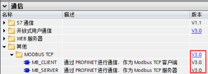 从TIA Portal V12 SP1开始软件中增加了S7-1500的Modbus TCP块库(V3.0及以上版本),用于S7-1500与支持Modbus TCP的通信伙伴进行通信,如下图2所示。S7-1500支持ModbusTCP指令的所有库版本,在用户程序中调用和参数化"MB_CLIENT"和"MB_SERVER"指令。