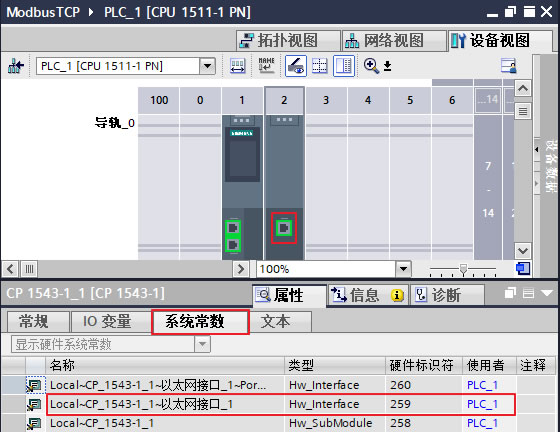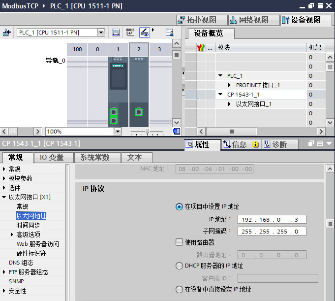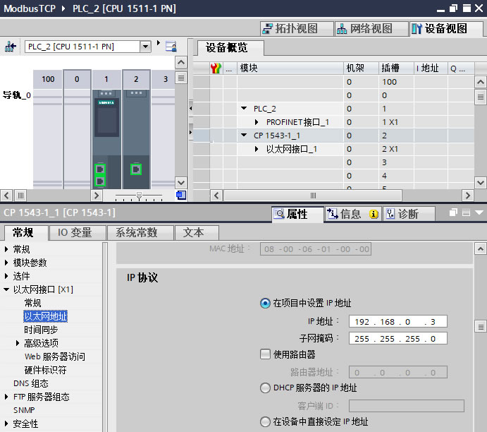 1.1、打开 TIA Portal V16软件,新建一个项目命名为 "ModbusTCP",在项目中添加 CPU1511-1PN V2.8 及CP1543-1 V2.2,为CP1543-1以太网接口新建一个子网并设置 IP地址为 "192.168.0.3",如下图 3 所示。