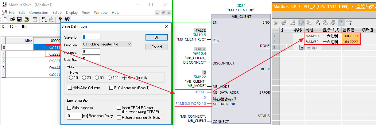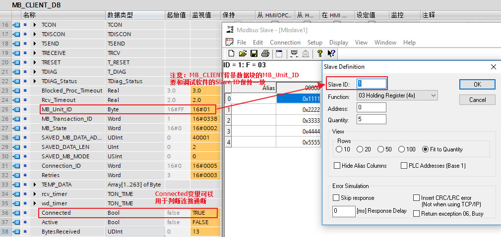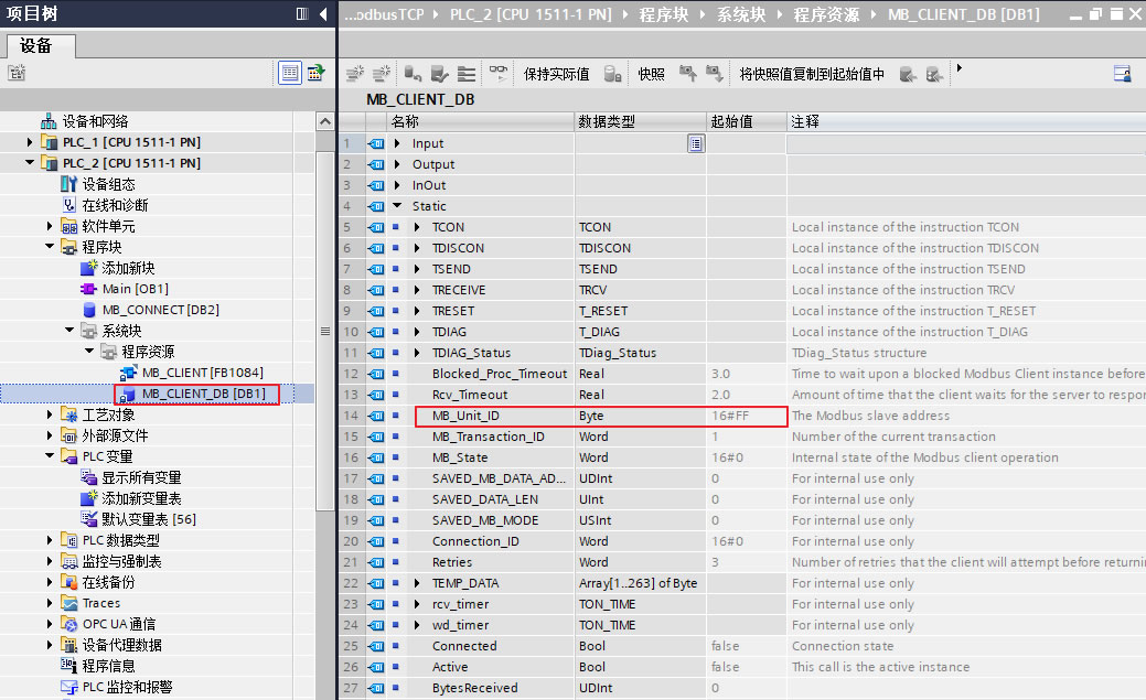 如果 S7-1500 作为 Modbus TCP 客户端与 Modbus TCP 服务器通信,并且尝试访问比 Modbus TCP 服务器更低端的串行子网中的设备,那么在此情形下会有报错 "无法建立连接"。这种情况下,就要使用 "MB_CLIENT" 参数了。"MB_UNIT_ID" 参数相当于 Modbus RTU 协议中的从站地址。如果将 Modbus TCP 服务器当做 Modbus RTU 协议中的网关,那么从站设备可以通过 "MB_UNIT_ID" 参数来识别。Modbus TCP 客户端直接向Modbus TCP 服务器发送请求,而Modbus TCP 服务器通过 "MB_UNIT_ID" 参数将请求转发到从站设备。