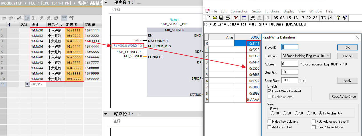 在本应用实例中,通过以下产品进行Modbus TCP编程,实现了S7-1500通过CP1543-1分别作为客户端和服务器与第三方测试软件进行通信。