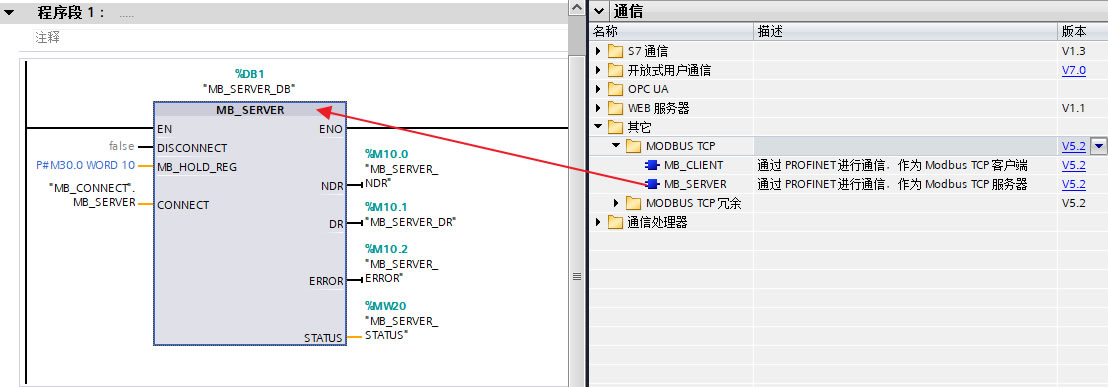 "MB_SERVER"指令通过CPU 或 CM/CP 的本地接口作为ModbusTCP服务器进行通信,无需要任何额外的硬件支持。"MB_SERVER"指令处理ModbusTCP客户端的连接请求,接收Modbus客户端的请求并发送响应消息。