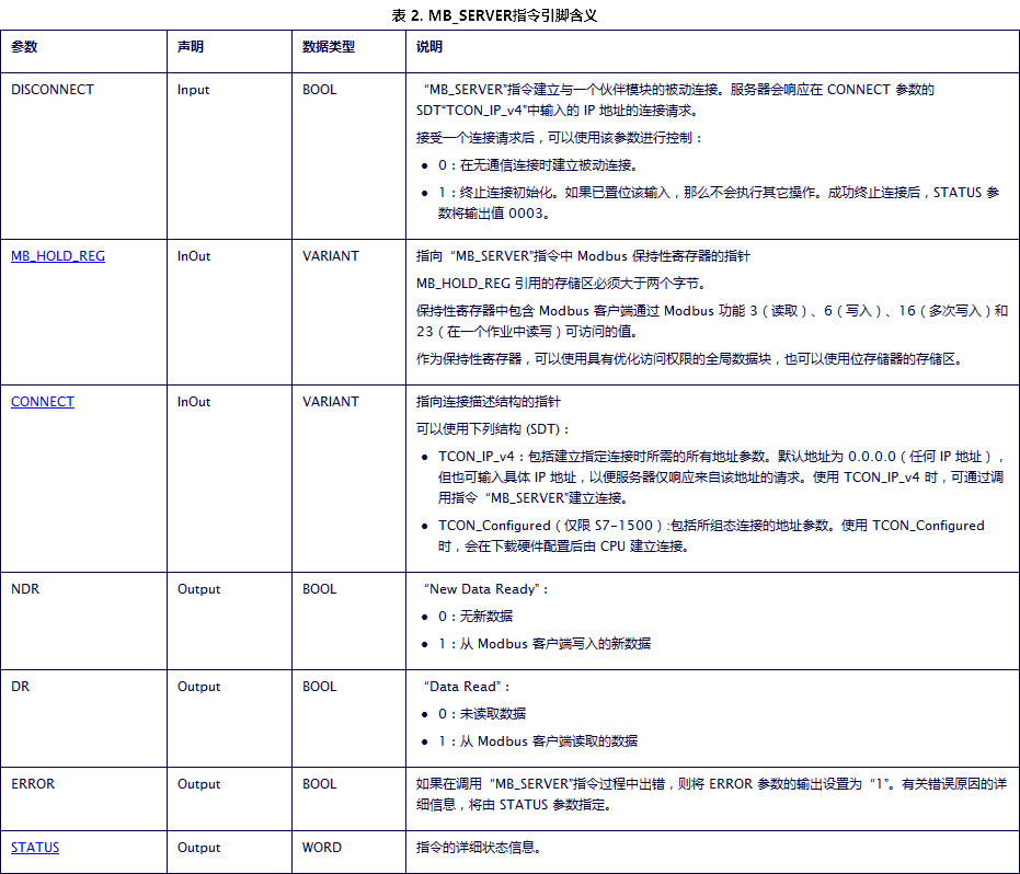02 读取:位 Input 10001~19999 过程映像输入 I0.0~I1249.6 03 读取:Word 保持性寄存器 40001~49999 400001~465535 全局数据(DB、过程映像、M区) 与指令引脚MB_HOLD_REG关联 04 读取:Word Input 30001~39999 过程映像输入 IW0~IW19996 05 写入:位 Output 1~9999 过程映像输出 Q0.0~Q1249.6 06 写入:Word 保持性寄存器 40001~49999 400001~465535 全局数据(DB、过程映像、M区) 与指令引脚MB_HOLD_REG关联 15 写入:位 Output 1~9999 过程映像输出 Q0.0~Q1249.6 16 写入:Word 保持性寄存器 40001~49999 400001~465535 全局数据(DB、过程映像、M区) 与指令引脚MB_HOLD_REG关联 1.4、使用上述指令实现CP1543-1为Modbus TCP的 Server与通信伙伴建立通信,通过表2可知CONNECT参数的设定有两种方式,下面分别介绍这两种方式如何创建CONNECT参数。