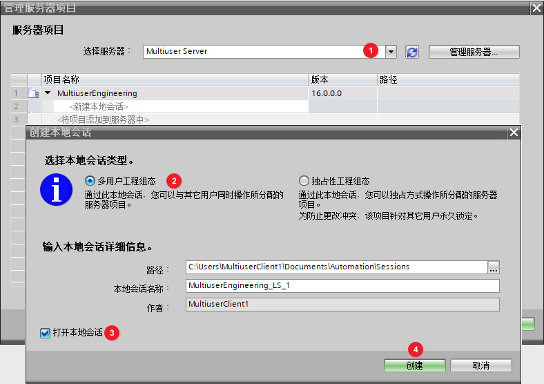 打开一个空 TIA Portal 项目,进入 “项目>项目服务器>管理服务器项目” 界面,选择图 15 所创建的服务器,双击 “新建本地会话” ,选择工程组态类型,这里选择多用户工程组态,然后选择是否打开本地会话,单击 “创建” 完成本地会话的创建,如下图 16 所示。