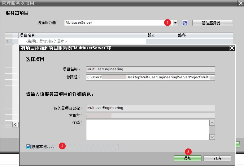 打开一个单用户项目,进入 “项目>项目服务器>管理服务器项目” 界面,选择图 12 所创建的服务器,双击 “将项目添加到服务器中” 并勾选 “创建本地会话” ,也可以单独创建本地会话,单击“添加”,如下图 13 所示。