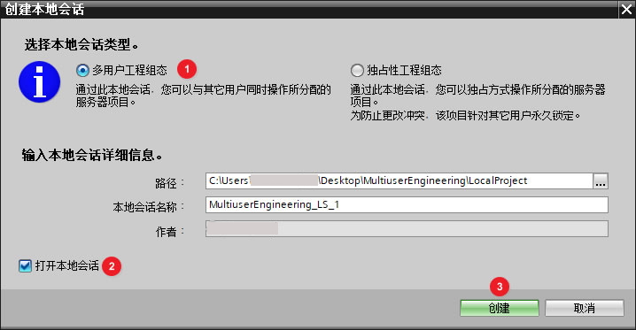 添加完成后会自动弹出 “创建本地会话” 对话框,选择工程组态类型,这里选择多用户工程组态,然后选择是否打开本地会话,单击 “创建” 完成本地会话的创建,如下图 14 所示。