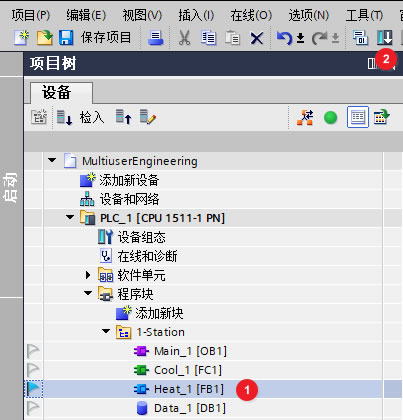 在调试阶段使用 Multiuser Commissioning 进行多用户操作前,这些项目需已通过 Multiuser Engineering 进行了编辑且包含有完整的硬件配置、所需块、连接和全局设置。
