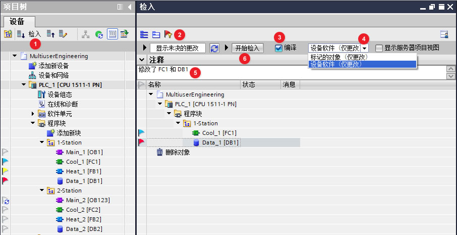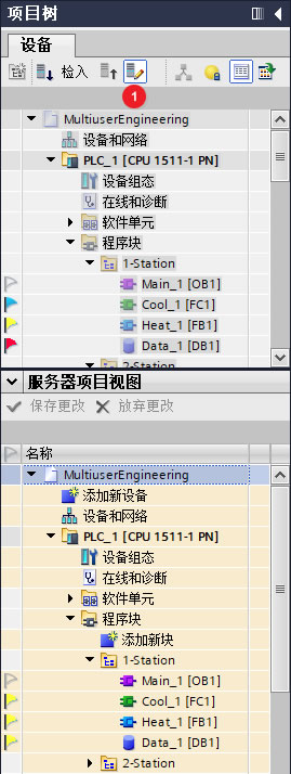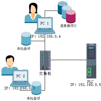 自 TIA Portal V14 起支持 Multiuser Engineering,在 Multiuser Engineering 框架内可以同时与多名工程师合作开展多用户服务器项目,每个工程师自行创建一个本地会话,在本地会话中,相应的工程师可以添加更改,然后将其检入到多用户服务器项目以进行发布,检入后,本地会话中所做的更改将再次提供给服务器项目中的所有工程师。