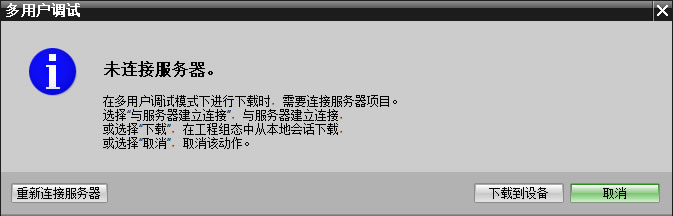 在 “调试模式” 下开始下载到 CPU 中时,系统将尝试与多用户服务器建立连接,对项目服务器中的本地会话进行更新,如果此时项目服务器无法访问,则在弹出的对话框中将显示一条相应消息, 如下图 32 所示。
