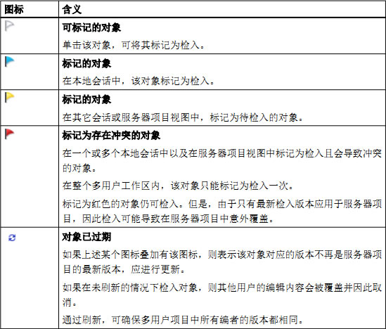 其他用户更改和检入的对象在本地会话中的对象状态图标上标记为