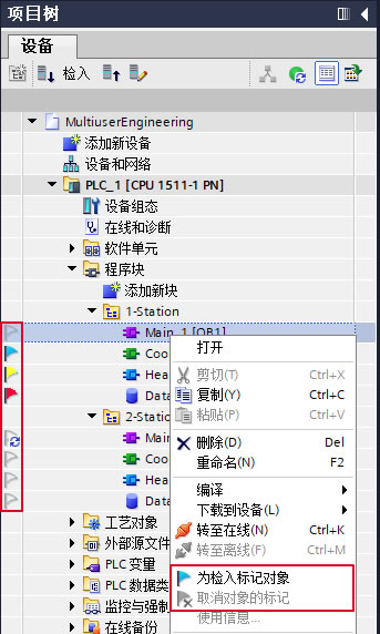 为了可以并行编辑多用户服务器项目中的对象,每个客户端必须标记在其本地会话中分配给他要编辑的对象,只有标记为检入的对象,才能在编辑后传送到服务器项目中。 可以通过鼠标右键对象选择 “为检入标记对象”,也可以直接单击对象前端的小旗子图标,标记后会变换相应的颜色,各种颜色图标所代表含义如表 1 所示,如下图 18 所示。