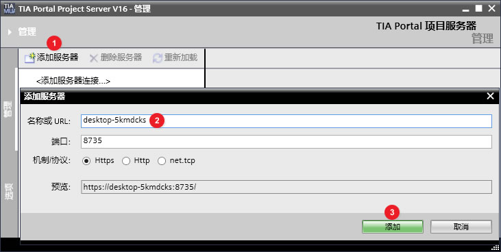 在 PC1 服务器上通过开始菜单打开 “TIA Portal Project Server V16 - Administration” 工具,单击添加服务器,在添加服务器对话框中输入服务器用户名或IP地址及端口号,选择连接机制,这些信息在图 8 中可以找到,如下图 9 所示。