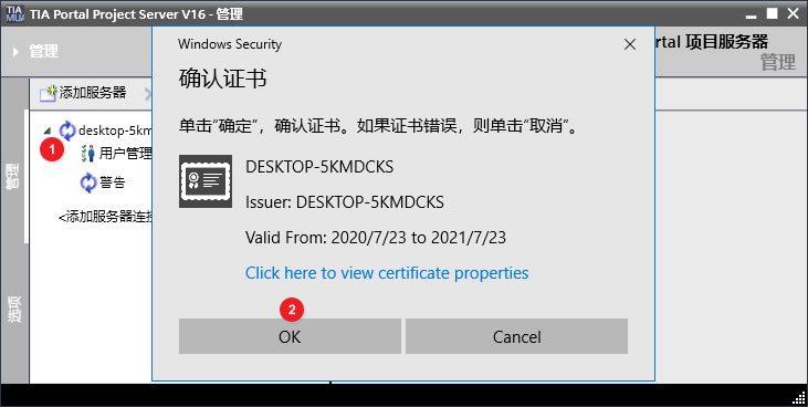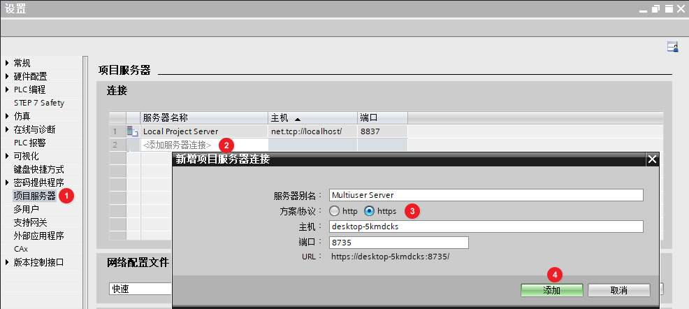 在 PC1 服务器上进入 TIA Portal “选项>设置>项目服务器” 界面,双击 “添加服务器连接” ,根据图 8 设置服务器分主机名或IP地址及端口号,还可以自行定义别名,最后单击 “添加” 按钮,如下图 12 所示。