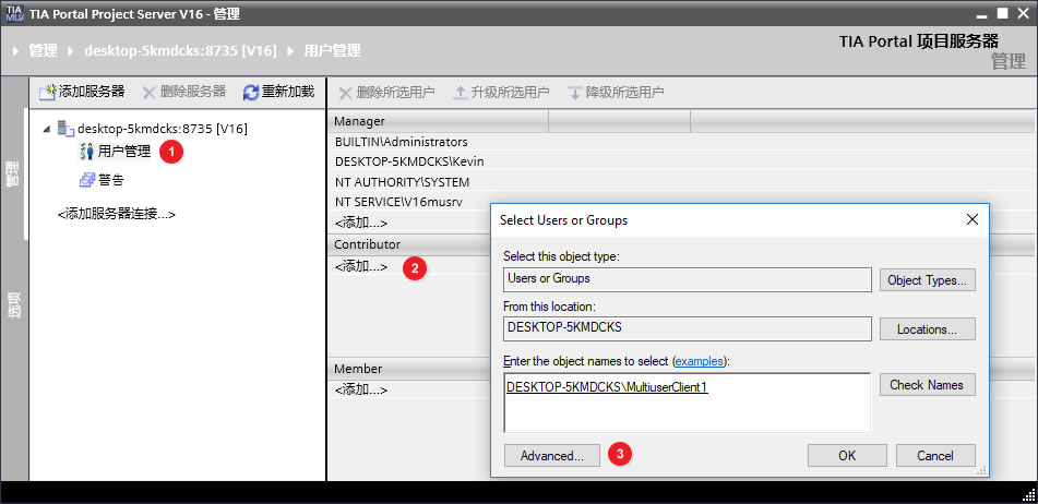 在 PC2 客户端上进入 TIA Portal “选项>设置>项目服务器” 界面,双击 “添加服务器连接” ,根据图 8 设置服务器分主机名或IP地址及端口号,还可以自行定义别名,最后单击 “添加” 按钮,如下图 15 所示。