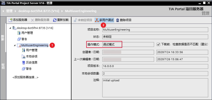 在 PC 1 服务器上打开 “TIA Portal Project Server V16 - Administration” 工具,选择相应服务器项目,通过单击 “多用户调试” 按钮来激活或取消激活调试模式。激活后工具栏中调试按钮显示为