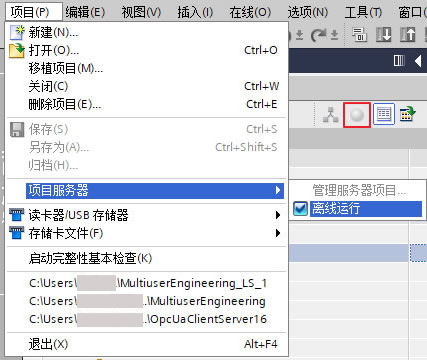 如果暂时无法与服务器建立连接,可以临时使用离线运行模式(TIA Portal V15及以上版本支持),勾选“离线运行”后工具栏中服务器状态图标由绿色变为灰色,当重新与服务器建立连接后,要把修改部分重新检入服务器,并刷新服务器项目,如下图 26 所示。