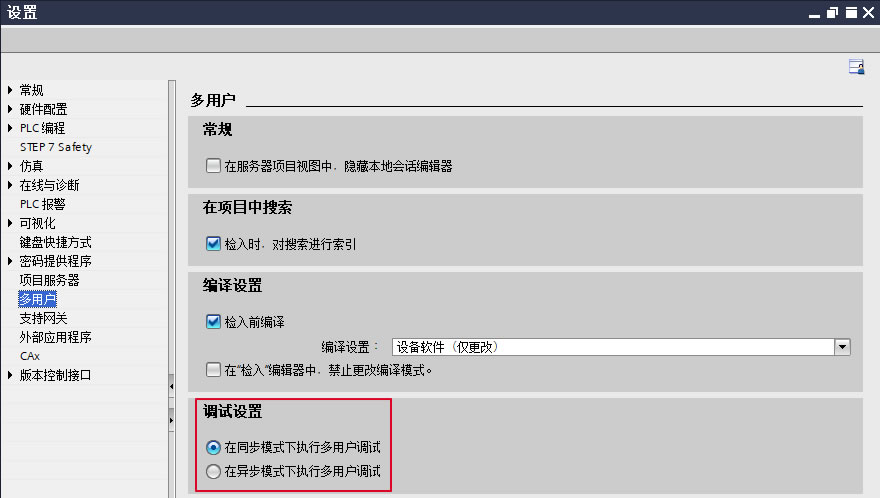 自 TIA Portal V16 起,Multiuser Commissioning 在 “同步模式” 和 “异步模式” 下均可用。可以在 TIA Portal 设置中通过 “选项 > 设置 > 多用户 > 调试设置” 切换同步和异步调试,如下图 29 所示。