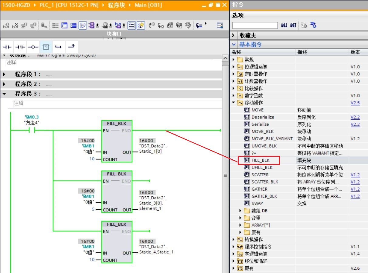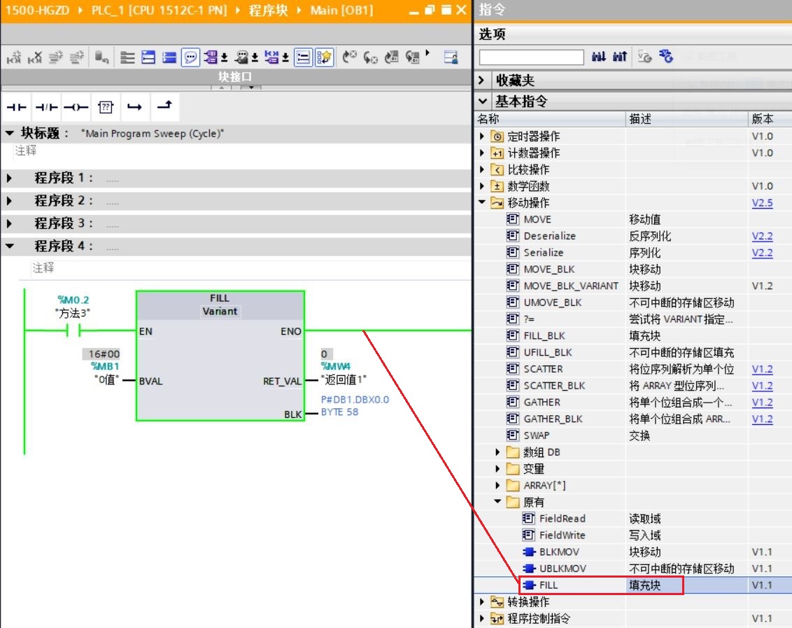 在OB1内,从"指令">"基本指令">"移动操作">"原有"下,调用FILL指令,如图7所示。