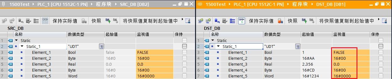 (3) 指令执行结果,如图4所示。"DST_Data" DB1(目标DB)内数据全部清零。