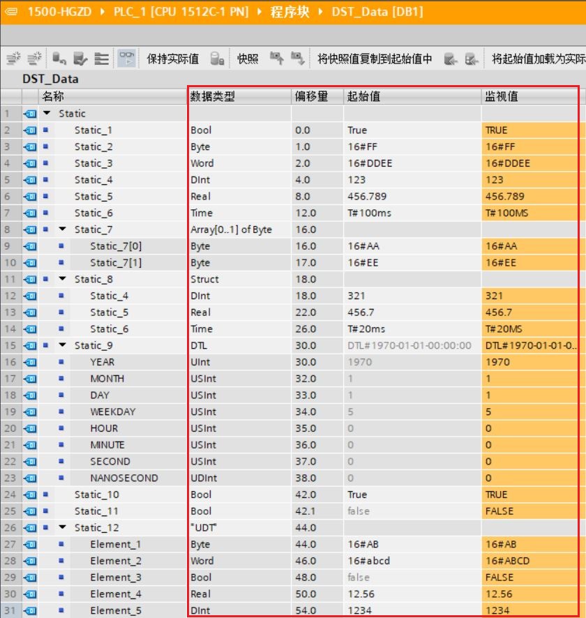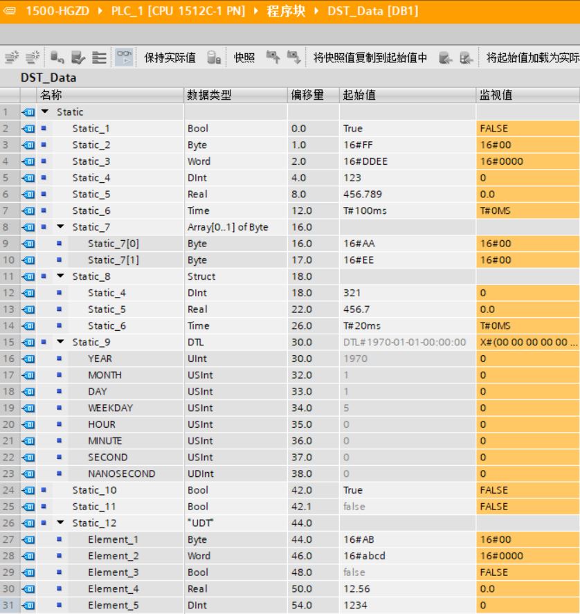 在S7-1500CPU内添加非优化DB块 "DST_Data" DB1(目标DB),数据类型任意创建,如图1所示。