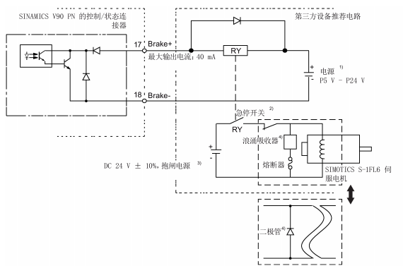 200V系列带抱闸:要将抱闸控制线缆接到驱动器的17、18号脚,所以需要IO线缆,具体接线图如下: