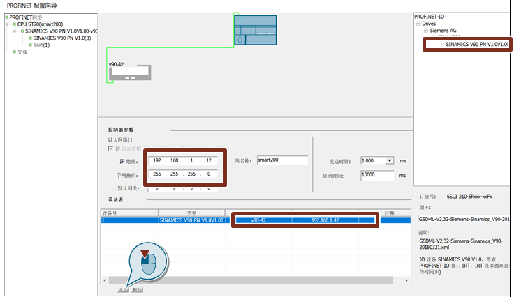 3. 设置PLC的IP地址,并且添加V90 PN驱动器并设置IP地址和设备名称