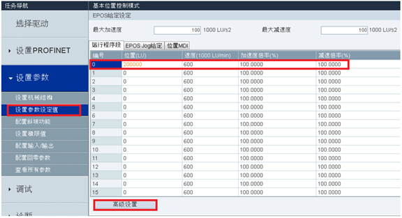 (1) 在程序段中,设定动态参数如位置、速度、加速度倍率和减速度倍率