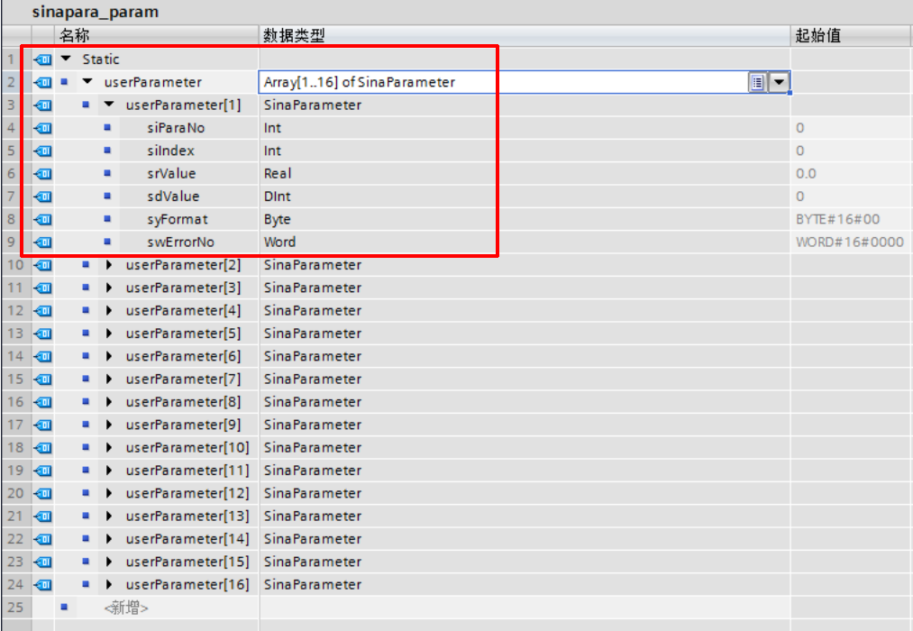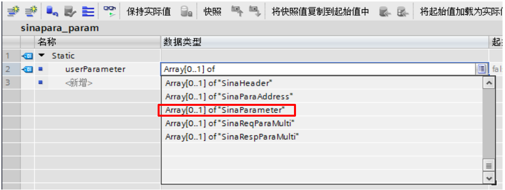 先将选件包中的sinapara指令添加到程序 ,再添加一个新的全局DB块,命名为sinapara_param(可以随意命名) ,打开新建的背景数据编辑器,