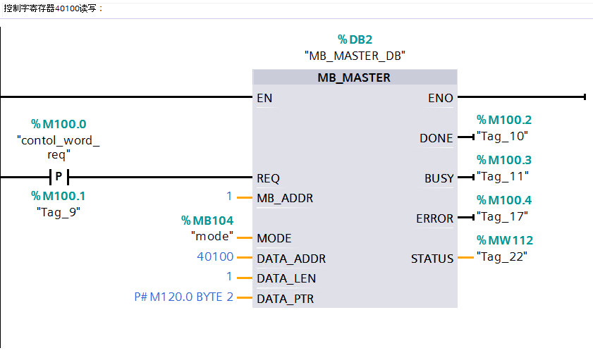 "MB_MASTER"指令允许程序作为 Modbus 主站使用点对点模块 (CM) 或通信板 (CB) 上的端口进行通信。传送启动后,EN 参数 (LAD/FBD) 必须保持设置为值"1",直到指令将 DONE 或 ERROR 输出参数设置为"1"为止。