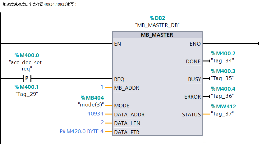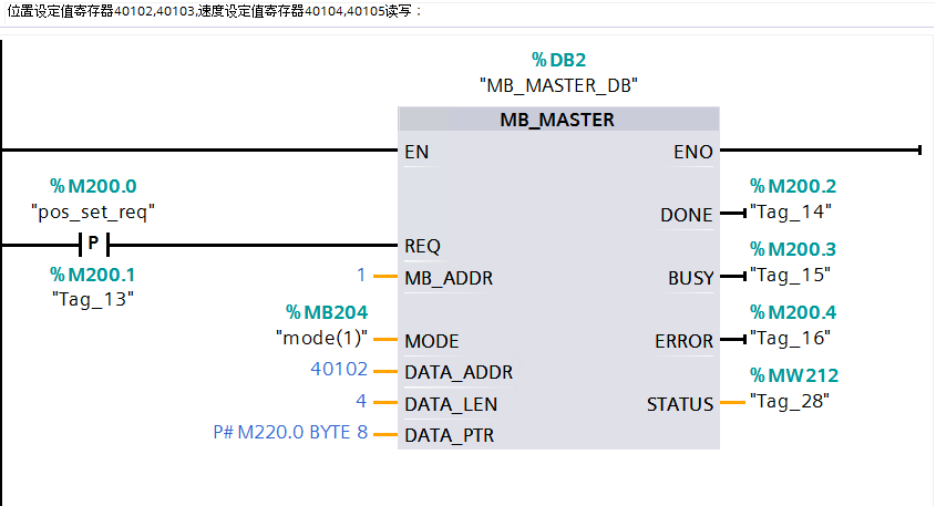 (6) 通过MB_MASTER功能块,将位置设定值和速度设定值以及加速度减速度倍率写入寄存40102、40103、40932、40933、40934和40935中