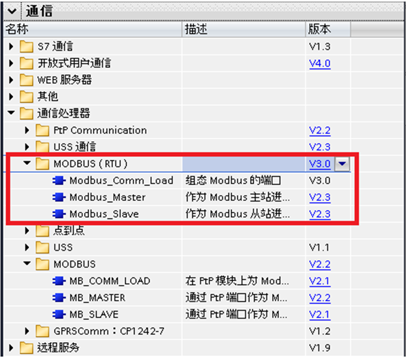 博途中为S7-1200的MODBUS通信提供了MODBUS(RTU)V3.0的指令库。