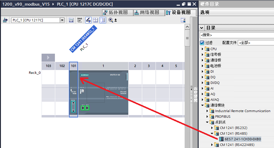(1) 在设备视图中将实际使用的通信模块拖入到画面中