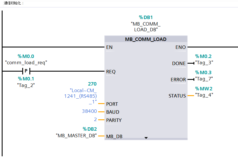"MB_COMM_LOAD"指令用于组态端口使用 Modbus RTU 协议来通信。组态该端口后,可通过执行"MB_SLAVE"或"MB_MASTER"指令以通过 Modbus 进行通信。