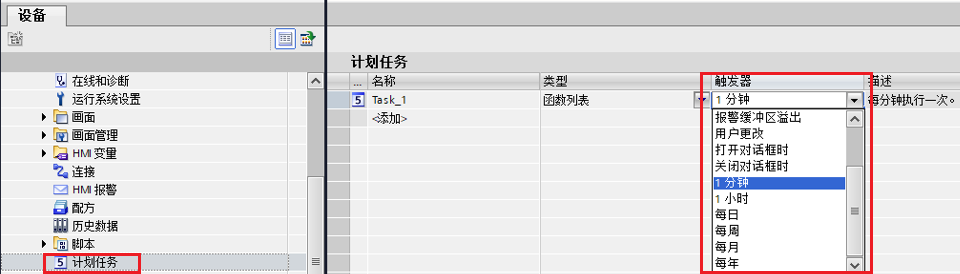 方法1:利用触摸屏计划任务功能实现脚本的循环调用。计划任务提供了多种触发器进行选择,触发器与任务相链接,并构成调用任务的触发事件。 在发生触发事件时,执行该任务。 本文以1分钟为例,实现脚本的循环调用。