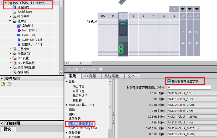 - 在PLC属性中启用时钟存储器。