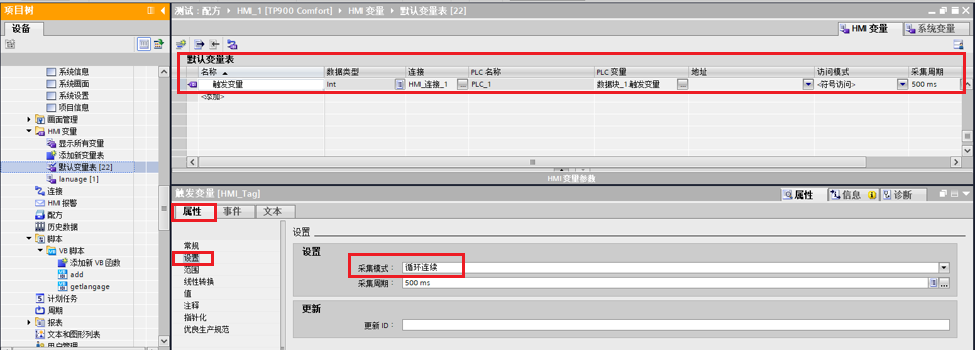 - HMI变量表中定义变量。设置变量的采集模式为循环连续。